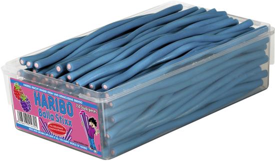 HARIBO Balla Stixx sind aromatisch gefüllte, längliche Fruchtgummi-Konfektstangen die Blauen in der beerigen Geschmacksrichtung Him& Brombeere.