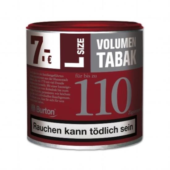 Burton Volumen Full Flavor L ist ein Volumentabak, der sich besonders gut zum stopfen von Zigaretten eignet. Für diesen außergewöhnlich geschmackvollen Tabak werden nur ausgewählte Burley, Virginia und Orient Tabake verwendet, welche bei gleichbleibend hoher Markenqualität und erstklassigem Geschmackserlebnis durch ein besonderes Herstellungsverfahren noch ergiebiger sind. Laut Herstellerangaben können mit einer Dose Burton Volumentabak bis zu 100 Zigaretten gefertigt werden.